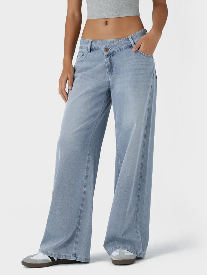 Asymmetric Low Rise Zipper Pockets Baggy Wide Leg Washed Casual Jeans